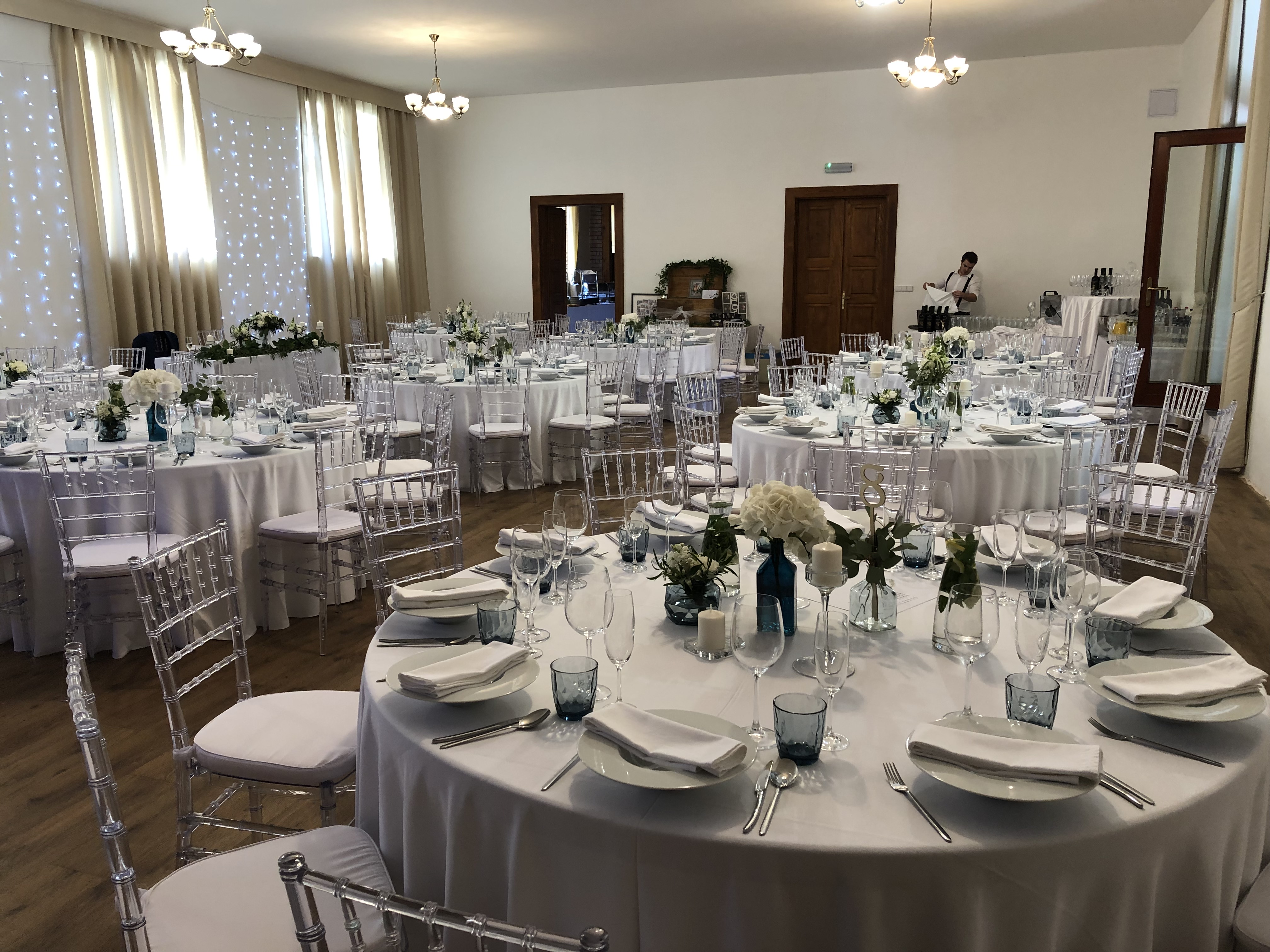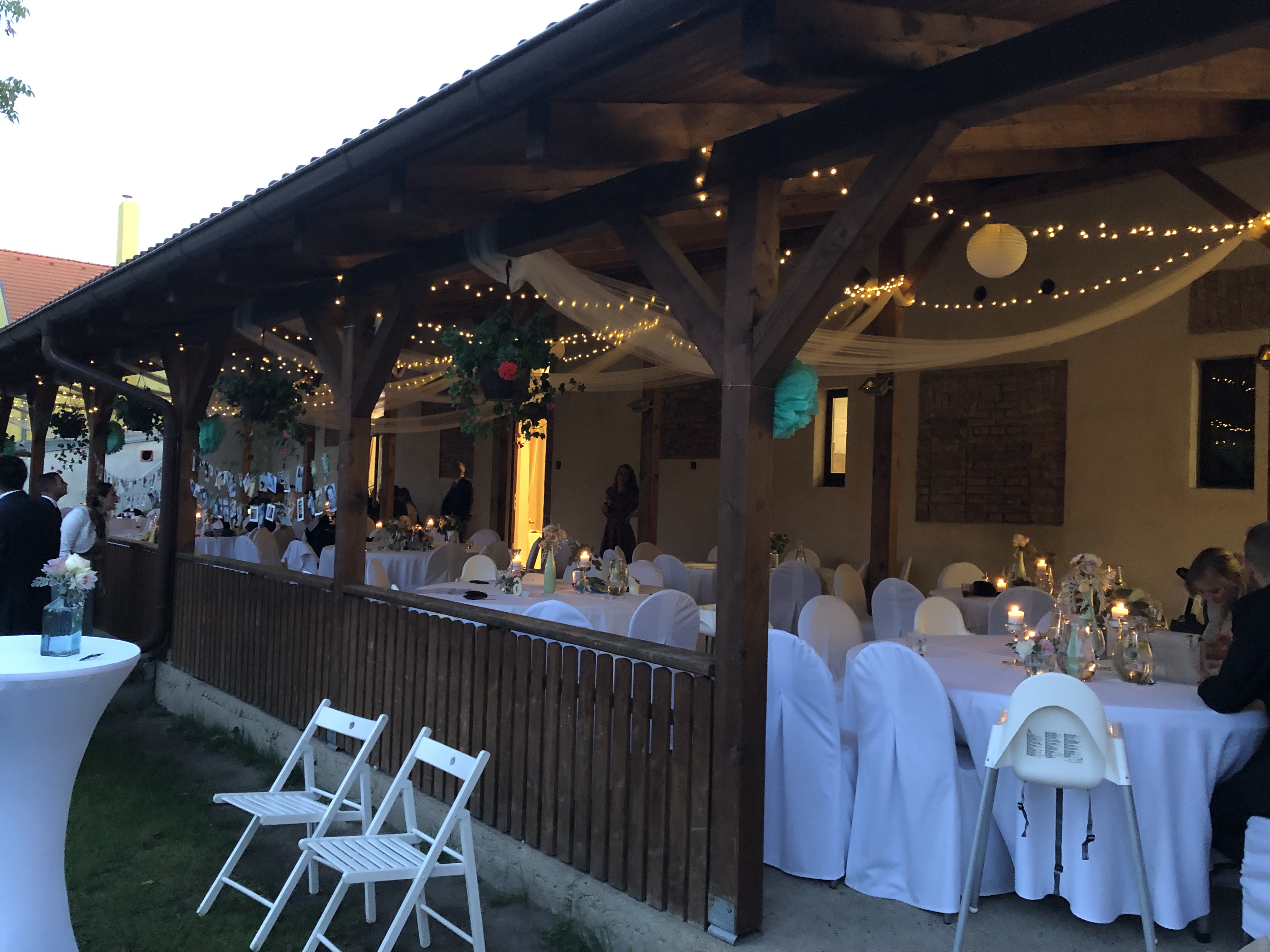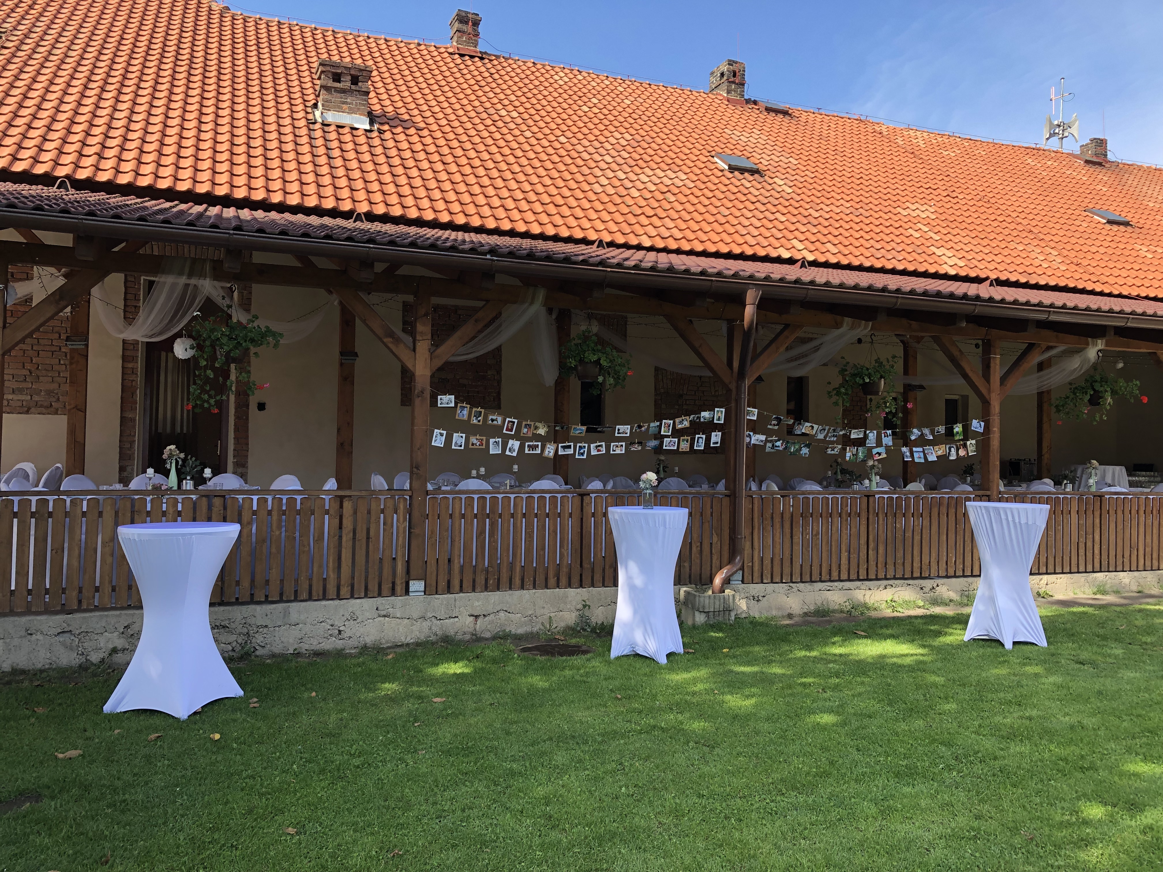 - zajištění květinové výzdoby a dekorace včetně světelných řetězů ve velkém sále a na kryté terase